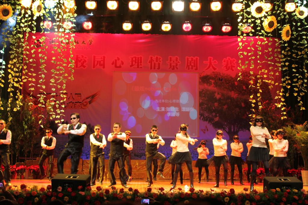 本屆校園心理情景劇大賽的主題是“營(yíng)造和諧人際,培養(yǎng)陽(yáng)光心態(tài)”。八支參賽代表隊(duì)緊緊圍繞人際交往、求職應(yīng)聘等校園日常情景展開,細(xì)膩而生動(dòng)地反映出了大學(xué)生成長(zhǎng)成才過程中出現(xiàn)的心理矛盾和心理困惑,并通過舞臺(tái)表現(xiàn)形式展現(xiàn)了大學(xué)生如何合理宣泄不良情緒,如何以科學(xué)理性的方式應(yīng)對(duì)心理挫折。演員們極強(qiáng)感染力的表演,引起了觀眾一次次的共鳴。比賽中間,由校心理健康教育中心選送,大學(xué)生心理健康課程教師、各心理健康輔導(dǎo)站站長(zhǎng)參與演出的節(jié)目《最炫nobody style》結(jié)合了當(dāng)下最流行元素,充滿活力與激情的舞蹈引起全場(chǎng)觀眾的熱烈歡呼。