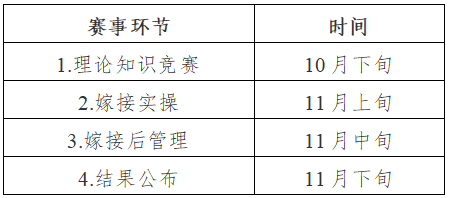 考核說明:嫁接所需的接穗和砧木幼苗由組委會提供;參賽選手在成果展示前完成視頻制作。嫁接技能競賽順序由組織方經(jīng)抽簽確定,參賽選手須按規(guī)定時間參賽,遲到15分鐘視為棄權(quán)。