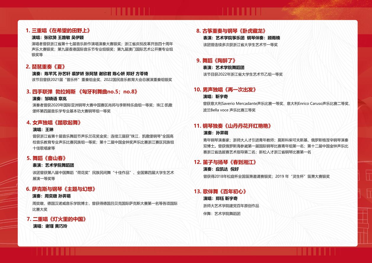 浙江師范大學是一所以教師教育為特色的綜合性省屬重點大學,堅持中國特色社會主義辦學方向和立德樹人根本任務,以“提升質量、提升特色、提升效益”為主線,秉承“礪學礪行、維實維新”校訓精神,重視美育教育。浙江省大學生藝術團是在省教育廳領導下,面向全省大學生的藝術團體。藝術團設總團和分團,浙江師范大學分團是首批設立的6個分團之一。浙江師范大學藝術團全力提升校園文化藝術品位,貫徹落實上級有關要求,統(tǒng)籌組織安排學生參與、開展各級各類學生藝術活動,把握每次參與機會,廣泛動員、精心組織、力推精品。學生屢次在國際舞臺上展現風采,連續(xù)受孔子學院總部、國家漢辦委派,先后赴美國、加拿大等10個國家開展中國文化大巡演,登上“中國—東盟藝術教育成果展演”國際舞臺,并參加省運會等大型活動演出。本場演出所選均為歷年來獲獎團隊、獲獎作品,參演青年教師多次獲國際大獎。