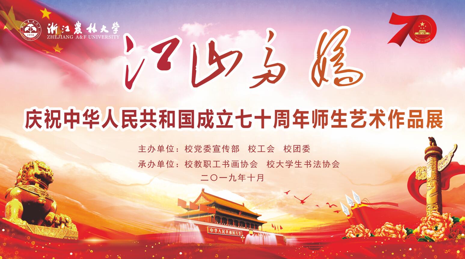 70年斗轉星移,70年滄海桑田,中國人民在中國共產黨的領導下披荊斬棘、風雨兼程,創造了舉世矚目的中國奇跡,中華民族走出了一條從獨立到富強的復興之路。在喜迎新中國成立70周年之際,為深入學習宣傳貫徹黨的十九大精神,謳歌新中國成立70年來的光輝成就,祝福祖國七十華誕,獻禮偉大新時代,學校特舉辦“江山多嬌——慶祝新中國成立70周年師生藝術作品展”。